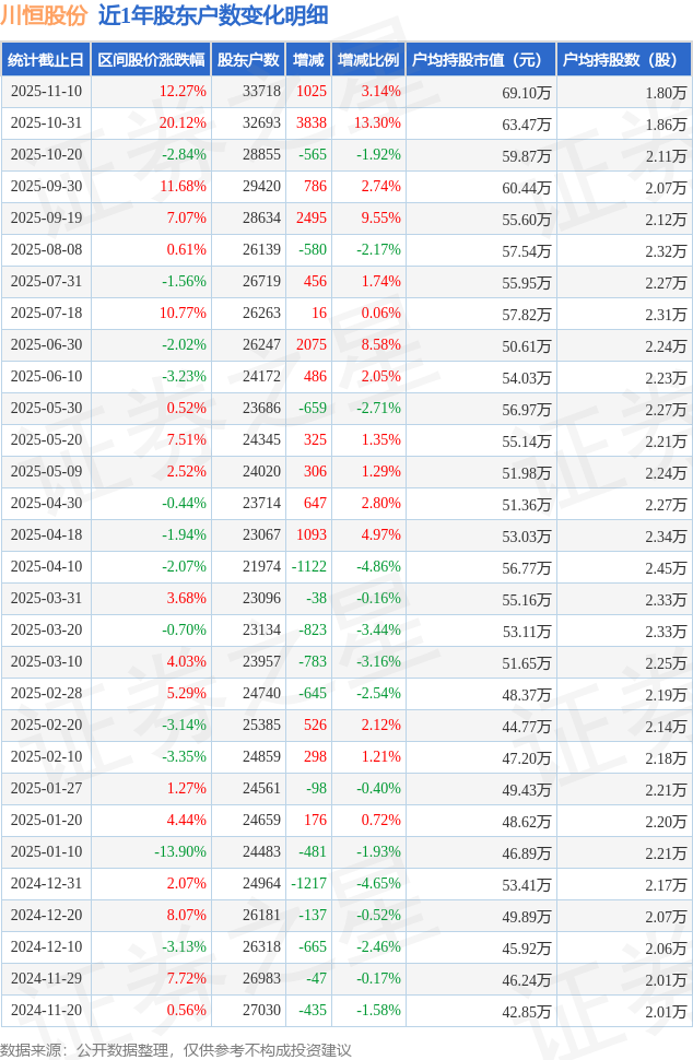 从股价来看,2025年10月31日至2025年11月10日,川恒股份区间涨幅为12.27%,在此期间股东户数增加1025.0户,增幅为3.14%。
