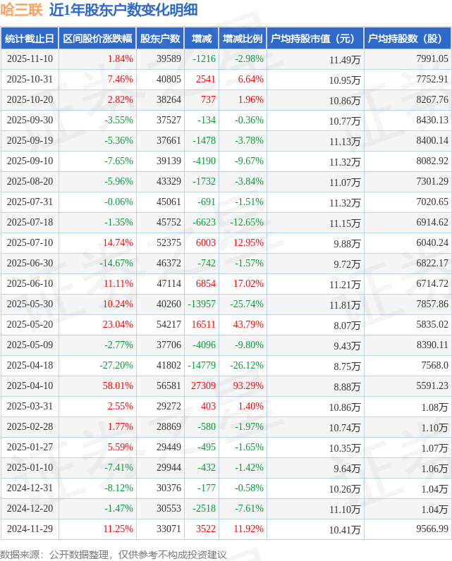 从股价来看,2025年10月31日至2025年11月10日,哈三联区间涨幅为1.84%,在此期间股东户数减少1216.0户,减幅为2.98%。