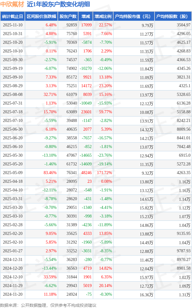 从股价来看,2025年10月31日至2025年11月10日,中欣氟材区间涨幅为6.48%,在此期间股东户数增加1.71万户,增幅为22.57%。