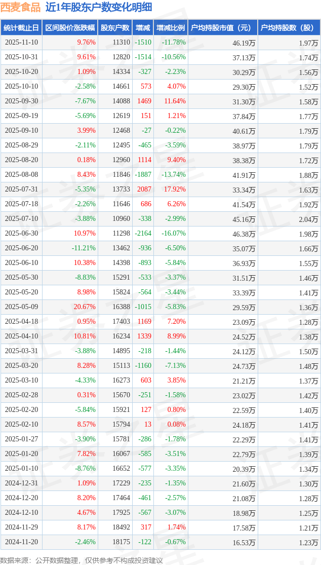从股价来看,2025年10月31日至2025年11月10日,西麦食品区间涨幅为9.76%,在此期间股东户数减少1510.0户,减幅为11.78%。