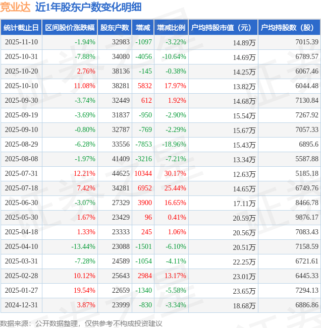 从股价来看,2025年10月31日至2025年11月10日,竞业达区间跌幅为1.94%,在此期间股东户数减少1097.0户,减幅为3.22%。