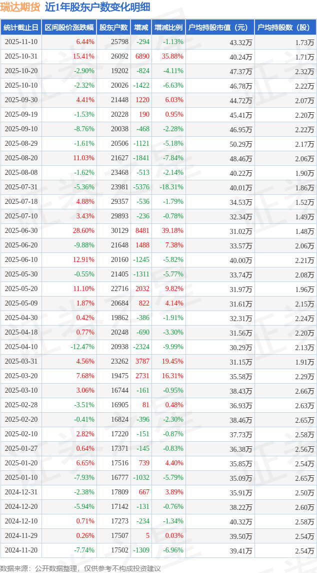 从股价来看,2025年10月31日至2025年11月10日,瑞达期货区间涨幅为6.44%,在此期间股东户数减少294.0户,减幅为1.13%。