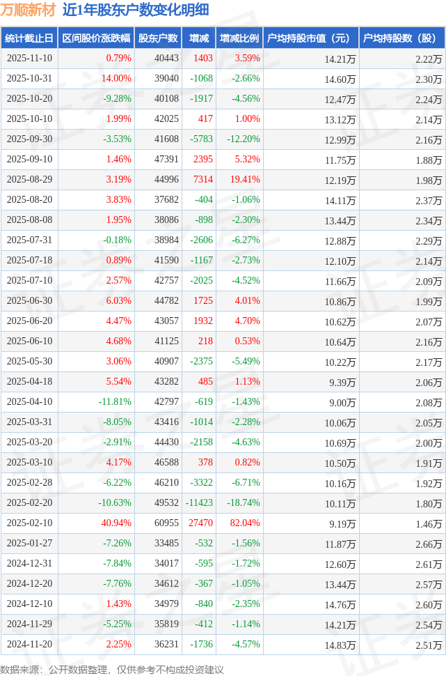 从股价来看,2025年10月31日至2025年11月10日,万顺新材区间涨幅为0.79%,在此期间股东户数增加1403.0户,增幅为3.59%。