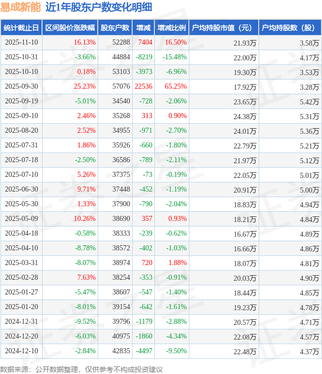 证券之星消息,近日易成新能披露,截至2025年11月10日公司股东户数为5.23万户,较10月31日增加7404.0户,增幅为16.5%。户均持股数量由上期的4.17万股减少至3.58万股,户均持股市值为21.93万元。