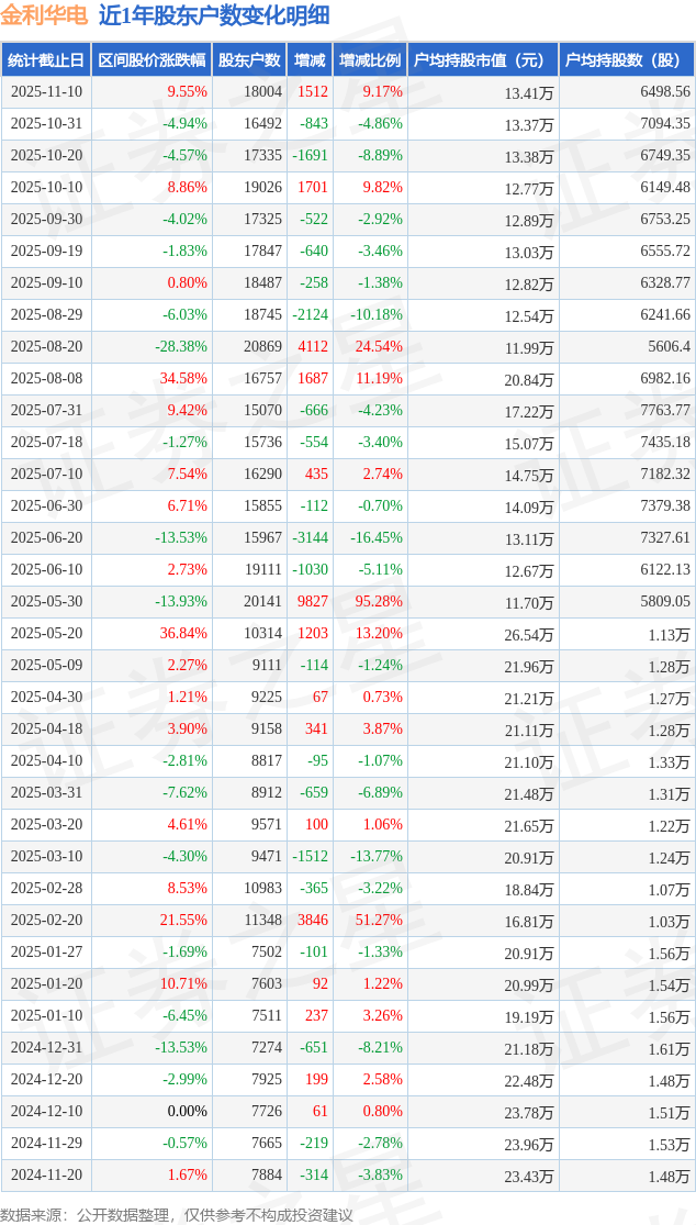 从股价来看,2025年10月31日至2025年11月10日,金利华电区间涨幅为9.55%,在此期间股东户数增加1512.0户,增幅为9.17%。
