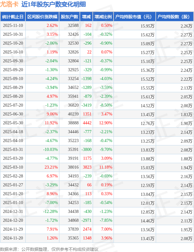 从股价来看,2025年10月31日至2025年11月10日,尤洛卡区间涨幅为2.62%,在此期间股东户数增加162.0户,增幅为0.5%。