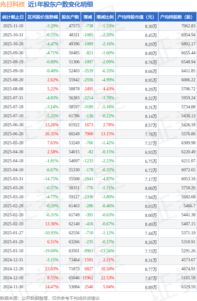 从股价来看,2025年10月31日至2025年11月10日,兆日科技区间跌幅为3.29%,在此期间股东户数减少738.0户,减幅为1.53%。