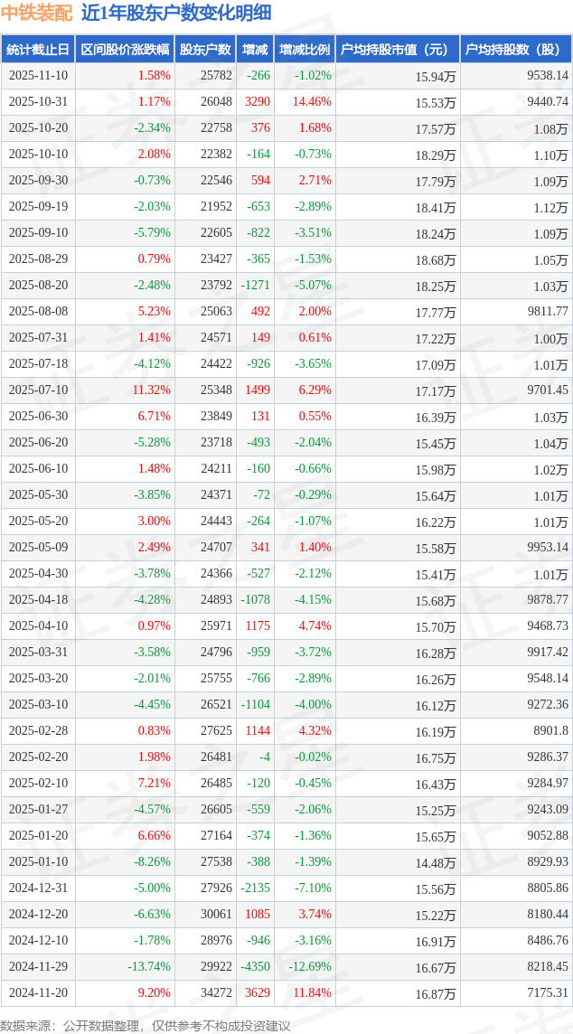 从股价来看,2025年10月31日至2025年11月10日,中铁装配区间涨幅为1.58%,在此期间股东户数减少266.0户,减幅为1.02%。