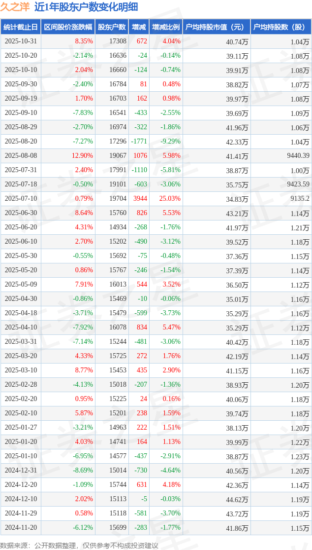 从股价来看,2025年10月20日至2025年10月31日,久之洋区间涨幅为8.35%,在此期间股东户数增加672.0户,增幅为4.04%。