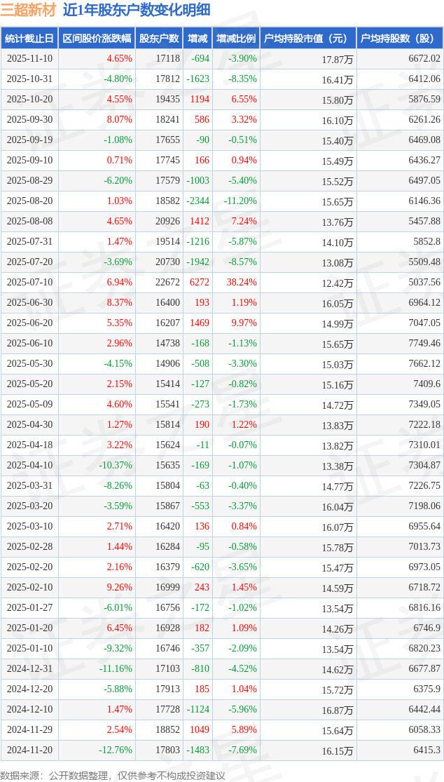从股价来看,2025年10月31日至2025年11月10日,三超新材区间涨幅为4.65%,在此期间股东户数减少694.0户,减幅为3.9%。