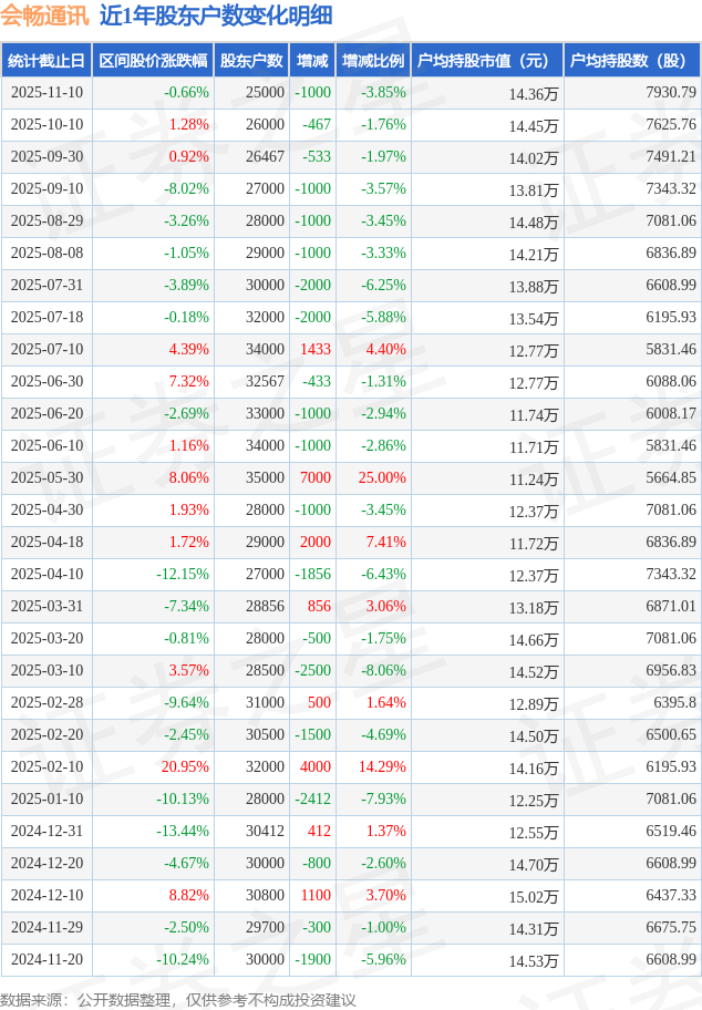 从股价来看,2025年10月31日至2025年11月10日,会畅通讯区间跌幅为0.66%,在此期间股东户数减少1000.0户,减幅为3.85%。