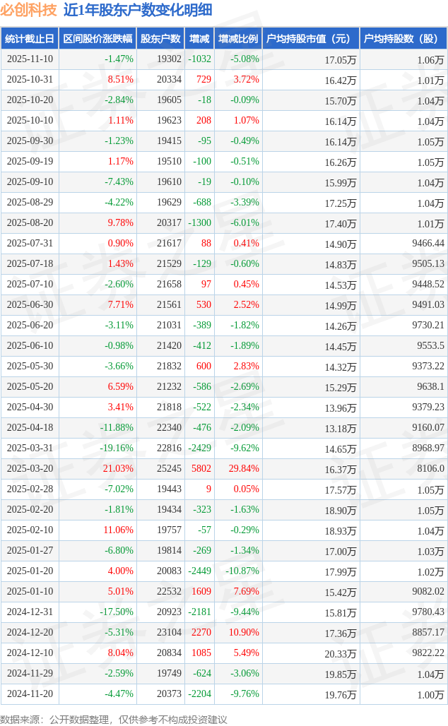 从股价来看,2025年10月31日至2025年11月10日,必创科技区间跌幅为1.47%,在此期间股东户数减少1032.0户,减幅为5.08%。