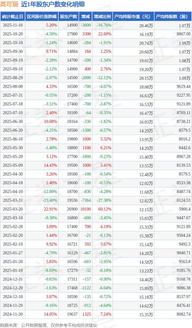 从股价来看,2025年10月20日至2025年11月10日,英可瑞区间涨幅为5.2%,在此期间股东户数减少3000.0户,减幅为16.76%。