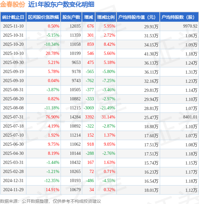从股价来看,2025年10月31日至2025年11月10日,金春股份区间涨幅为0.5%,在此期间股东户数增加676.0户,增幅为5.95%。