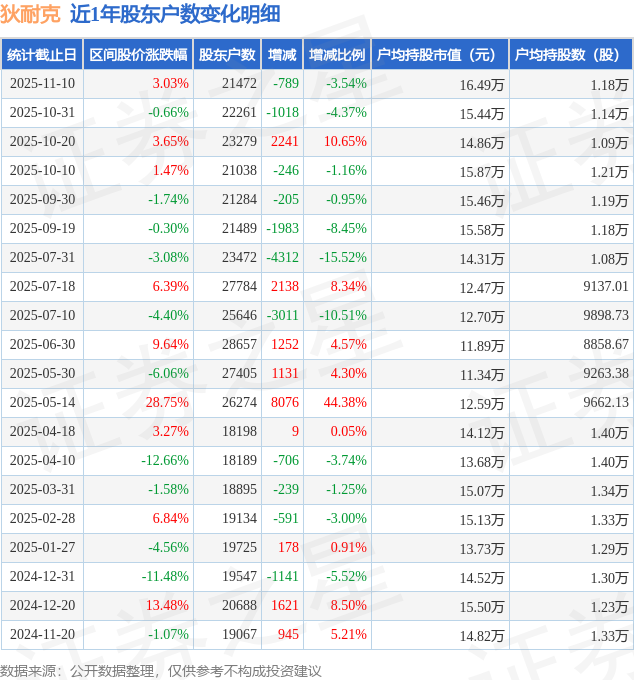 从股价来看,2025年10月31日至2025年11月10日,狄耐克区间涨幅为3.03%,在此期间股东户数减少789.0户,减幅为3.54%。