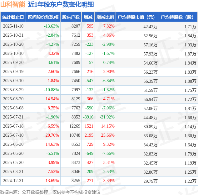 从股价来看,2025年10月31日至2025年11月10日,山科智能区间跌幅为13.63%,在此期间股东户数增加595.0户,增幅为7.82%。
