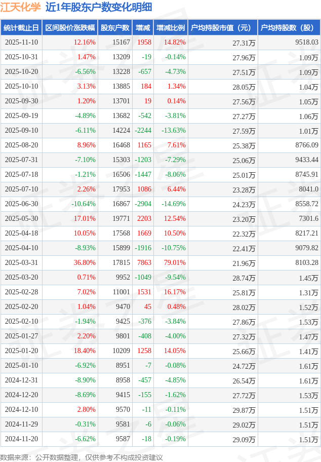 证券之星消息,近日江天化学披露,截至2025年11月10日公司股东户数为1.52万户,较10月31日增加1958.0户,增幅为14.82%。户均持股数量由上期的1.09万股减少至9518.0股,户均持股市值为27.31万元。