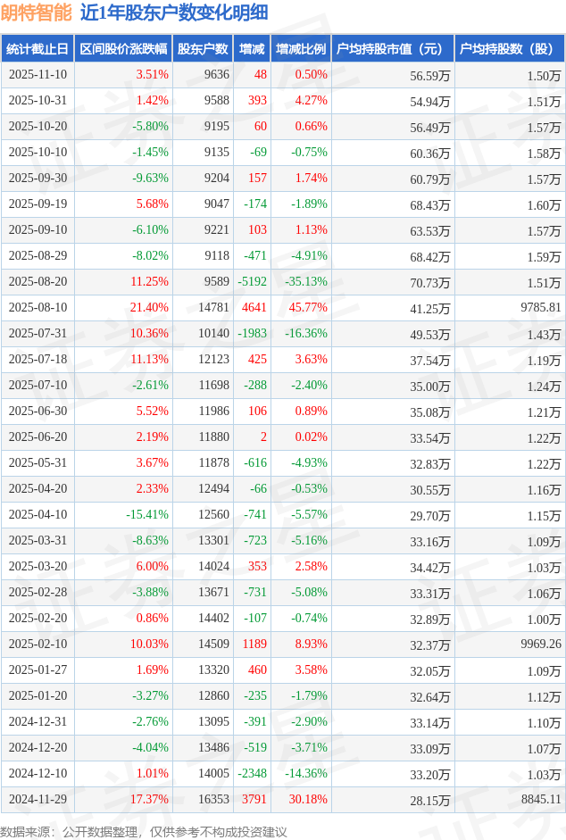 从股价来看,2025年10月31日至2025年11月10日,朗特智能区间涨幅为3.51%,在此期间股东户数增加48.0户,增幅为0.5%。