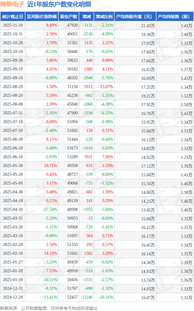 从股价来看,2025年10月31日至2025年11月10日,商络电子区间涨幅为8.49%,在此期间股东户数减少1131.0户,减幅为2.31%。