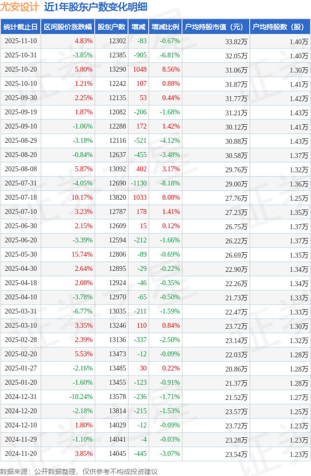 从股价来看,2025年10月31日至2025年11月10日,尤安设计区间涨幅为4.83%,在此期间股东户数减少83.0户,减幅为0.67%。