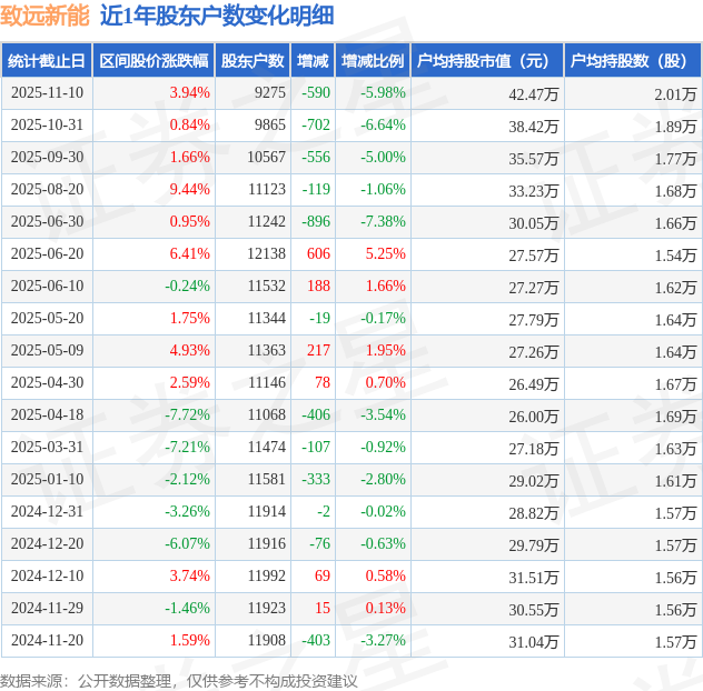 从股价来看,2025年10月31日至2025年11月10日,致远新能区间涨幅为3.94%,在此期间股东户数减少590.0户,减幅为5.98%。