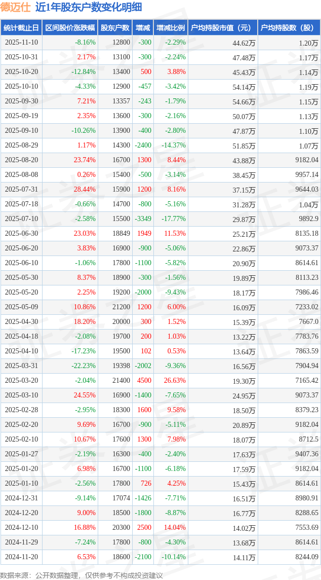 从股价来看,2025年10月31日至2025年11月10日,德迈仕区间跌幅为8.16%,在此期间股东户数减少300.0户,减幅为2.29%。