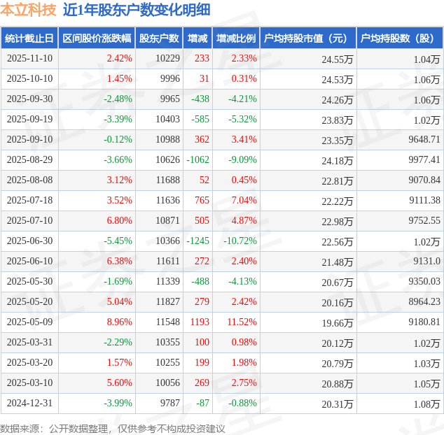 从股价来看,2025年10月10日至2025年11月10日,本立科技区间涨幅为2.42%,在此期间股东户数增加233.0户,增幅为2.33%。