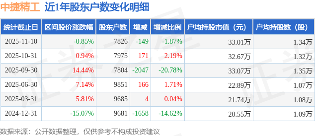 从股价来看,2025年10月31日至2025年11月10日,中捷精工区间跌幅为0.85%,在此期间股东户数减少149.0户,减幅为1.87%。