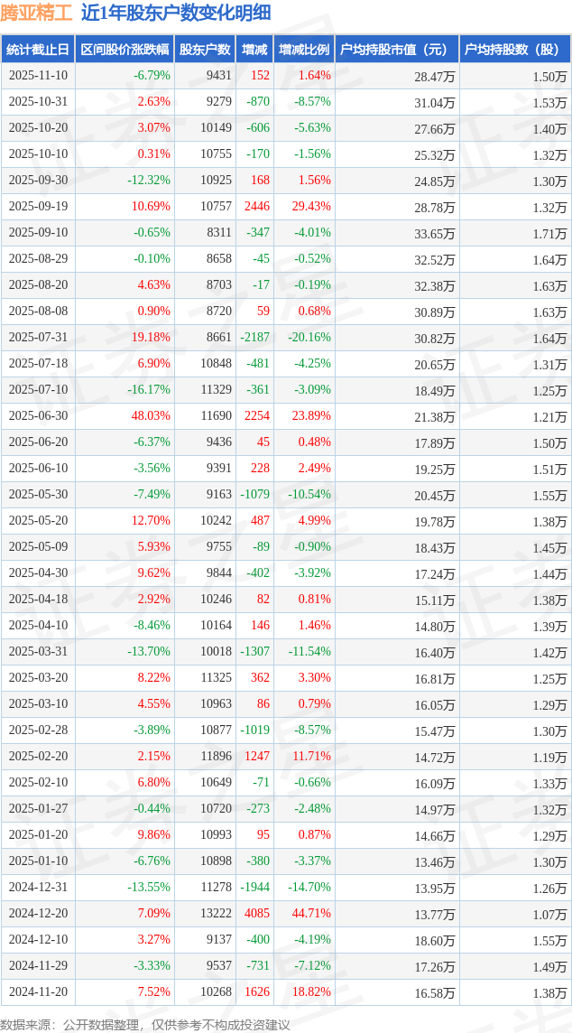 从股价来看,2025年10月31日至2025年11月10日,腾亚精工区间跌幅为6.79%,在此期间股东户数增加152.0户,增幅为1.64%。