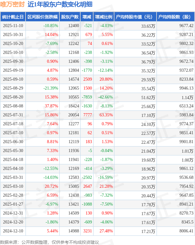 从股价来看,2025年10月31日至2025年11月10日,唯万密封区间跌幅为10.85%,在此期间股东户数减少521.0户,减幅为4.03%。