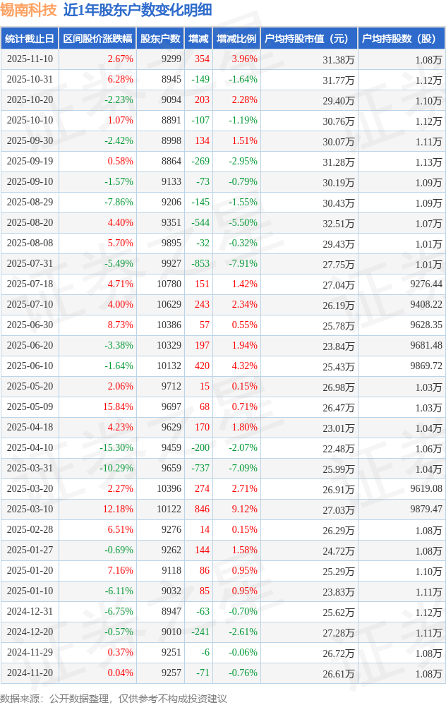 从股价来看,2025年10月31日至2025年11月10日,锡南科技区间涨幅为2.67%,在此期间股东户数增加354.0户,增幅为3.96%。
