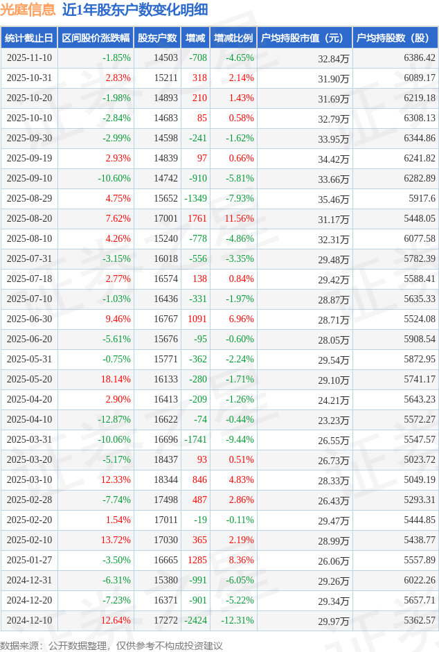 从股价来看,2025年10月31日至2025年11月10日,光庭信息区间跌幅为1.85%,在此期间股东户数减少708.0户,减幅为4.65%。