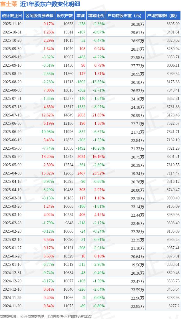 从股价来看,2025年10月31日至2025年11月10日,富士莱区间涨幅为0.17%,在此期间股东户数减少258.0户,减幅为2.36%。