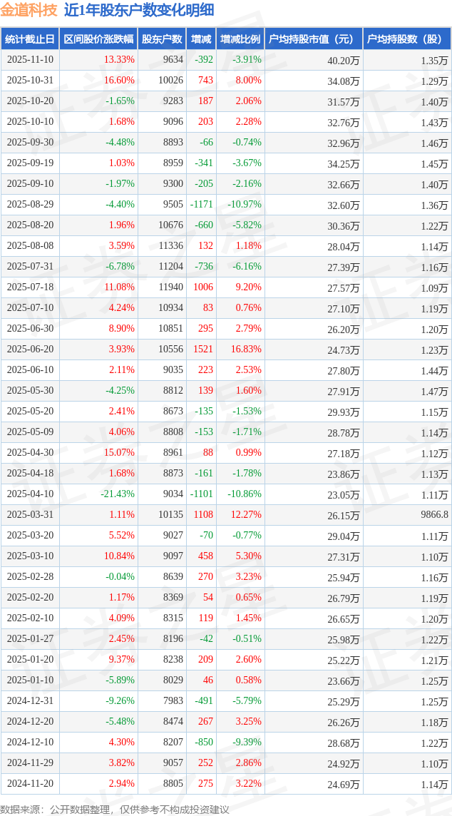 从股价来看,2025年10月31日至2025年11月10日,金道科技区间涨幅为13.33%,在此期间股东户数减少392.0户,减幅为3.91%。