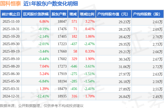 证券之星消息,近日国科恒泰披露,截至2025年11月10日公司股东户数为1.8万户,较10月31日增加571.0户,增幅为3.27%。户均持股数量由上期的2.69万股减少至2.61万股,户均持股市值为29.23万元。