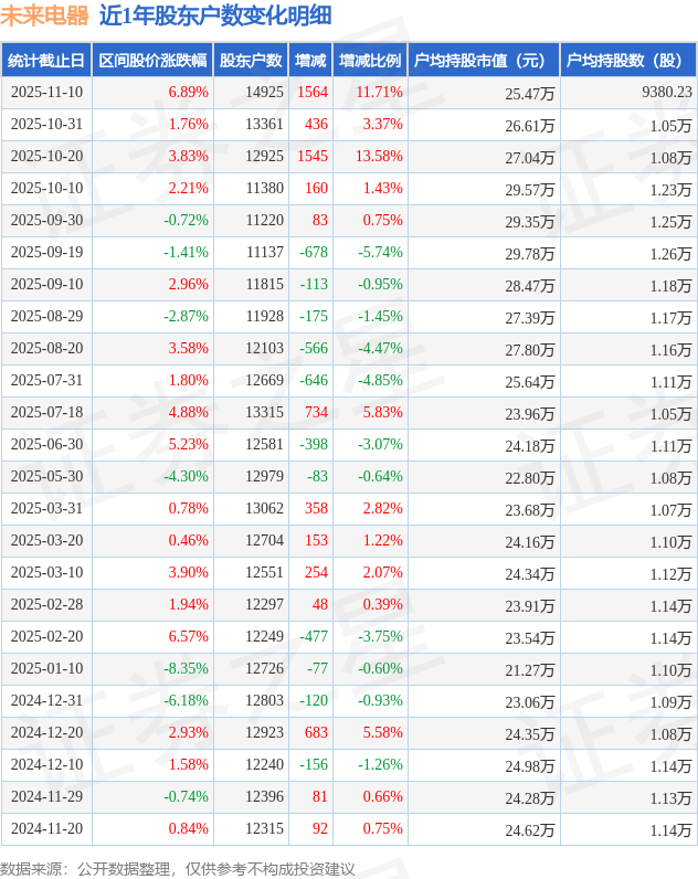 从股价来看,2025年10月31日至2025年11月10日,未来电器区间涨幅为6.89%,在此期间股东户数增加1564.0户,增幅为11.71%。