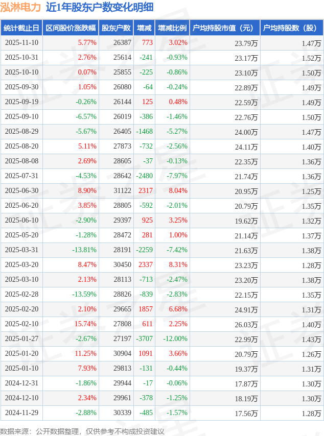 从股价来看,2025年10月31日至2025年11月10日,泓淋电力区间涨幅为5.77%,在此期间股东户数增加773.0户,增幅为3.02%。