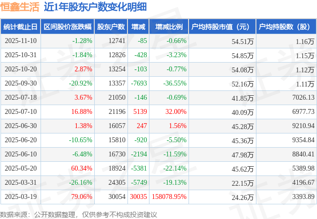 从股价来看,2025年10月31日至2025年11月10日,恒鑫生活区间跌幅为1.28%,在此期间股东户数减少85.0户,减幅为0.66%。