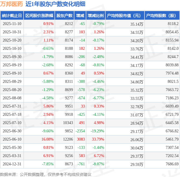 从股价来看,2025年10月31日至2025年11月10日,万邦医药区间涨幅为0.91%,在此期间股东户数减少65.0户,减幅为0.79%。