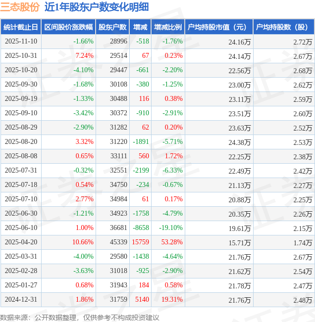 从股价来看,2025年10月31日至2025年11月10日,三态股份区间跌幅为1.66%,在此期间股东户数减少518.0户,减幅为1.76%。