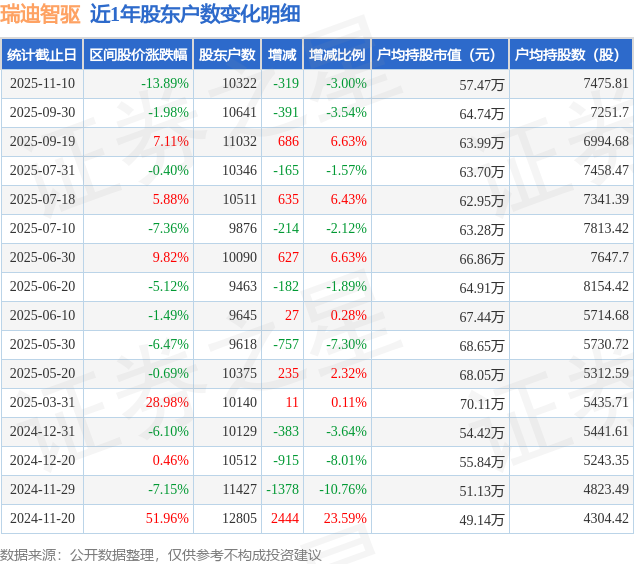 从股价来看,2025年9月30日至2025年11月10日,瑞迪智驱区间跌幅为13.89%,在此期间股东户数减少319.0户,减幅为3.0%。