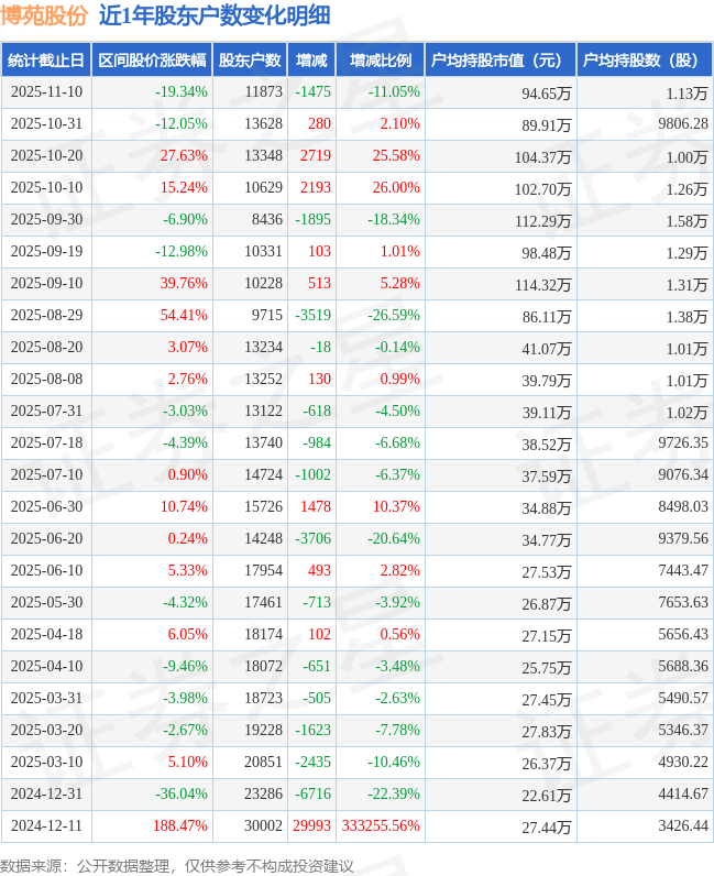 从股价来看,2025年10月20日至2025年11月10日,博苑股份区间跌幅为19.34%,在此期间股东户数减少1475.0户,减幅为11.05%。