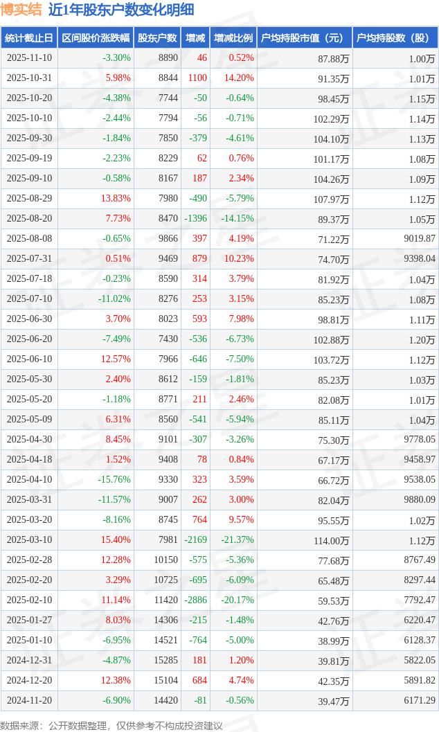 从股价来看,2025年10月31日至2025年11月10日,博实结区间跌幅为3.3%,在此期间股东户数增加46.0户,增幅为0.52%。