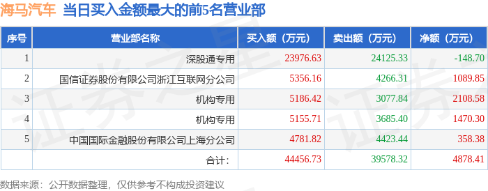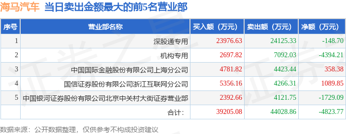 证券之星消息,沪深交易所2025年11月12日公布的交易公开信息显示,海马汽车(000572)因日跌幅偏离值达到7%的前5只证券登上龙虎榜。此次是近5个交易日内第4次上榜。