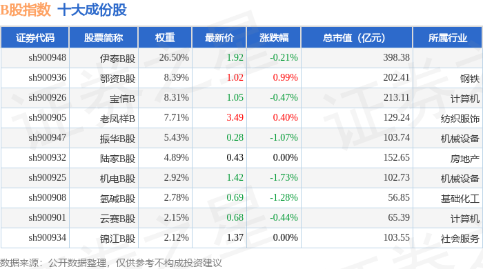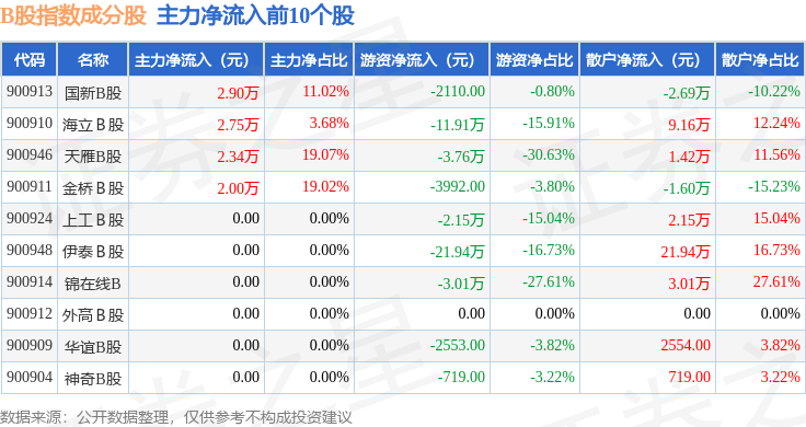 资金流向方面,B股指数(000003)成份股当日主力资金净流出合计57.88万元,游资资金净流出合计93.68万元,散户资金净流入合计151.56万元。成份股资金流向详情见下表: