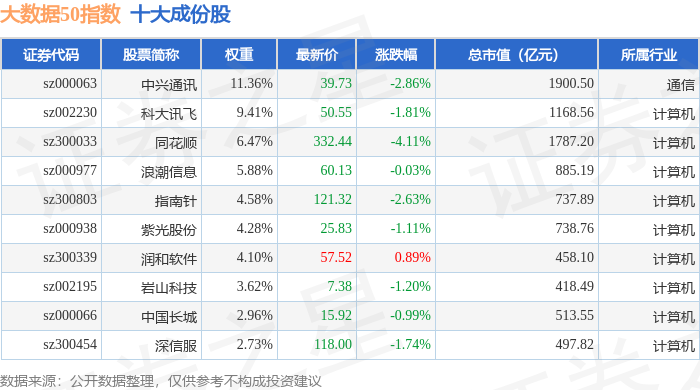 大数据50(399282)指数十大成份股详情如下: