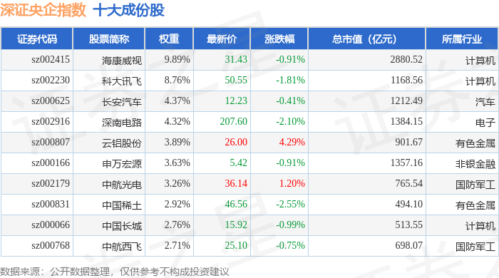 证券之星消息,11月12日,深证央企(399335)指数报收于4261.74点,跌0.74%,成交327.1亿元,换手率0.99%。当日该指数成份股中,上涨的有14家,云铝股份以4.29%的涨幅领涨,下跌的有36家,许继电气以4.78%的跌幅领跌。