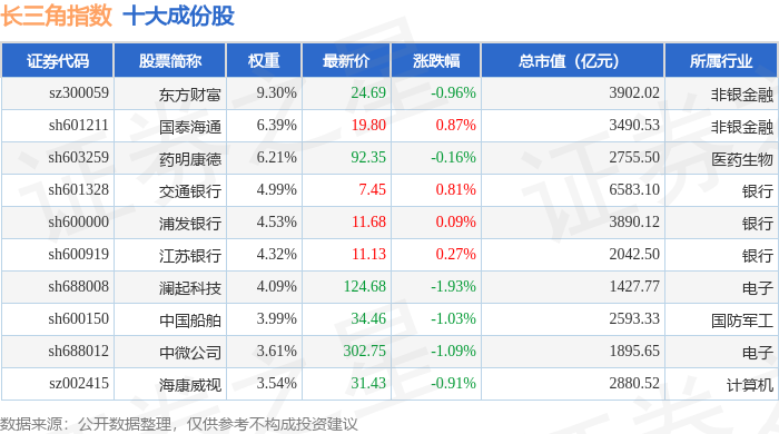 证券之星消息,11月12日,长三角(399355)指数报收于3685.53点,跌0.47%,成交584.06亿元,换手率0.62%。当日该指数成份股中,上涨的有13家,中国太保以2.56%的涨幅领涨,下跌的有27家,同花顺以4.11%的跌幅领跌。