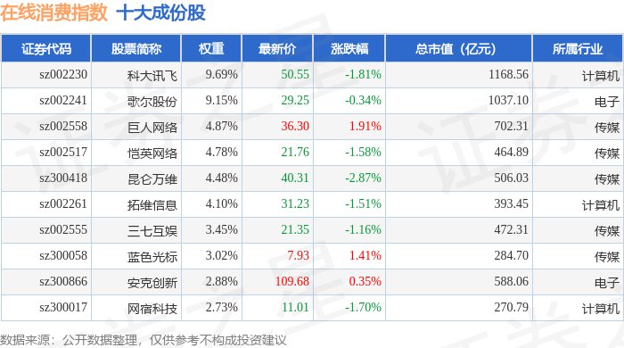在线消费(399361)指数十大成份股详情如下: