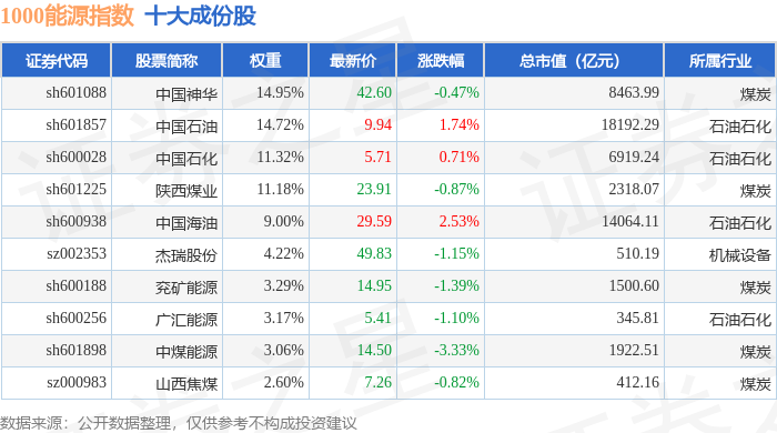 证券之星消息,11月12日,1000能源(399381)指数报收于3131.96点,涨0.19%,成交134.87亿元,换手率0.44%。当日该指数成份股中,上涨的有11家,石化油服以10.21%的涨幅领涨,下跌的有14家,美锦能源以3.55%的跌幅领跌。